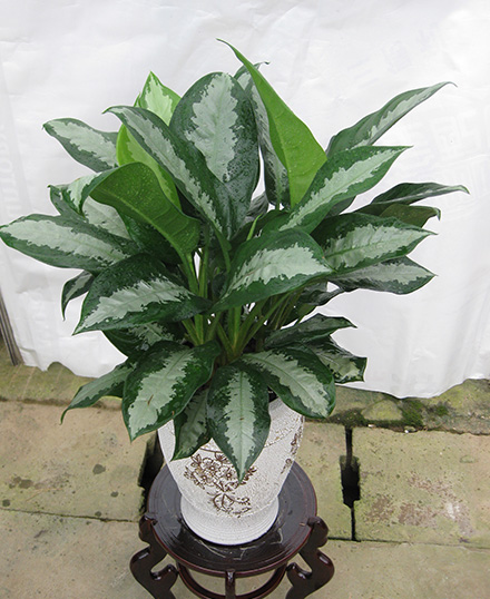 雅麗皇后又名白雪粗肋草、銀河粗肋草。植株直立,葉片披針形,革質(zhì),銳尖,葉深綠色。中肋兩側(cè)具銀灰色大塊條狀斑塊,葉緣與中脈處為暗綠色。本種生長勢強(qiáng),易生分枝。耐陰性極強(qiáng)。銀河粗肋草:葉闊披針形,沿中肋有銀灰色寬條斑